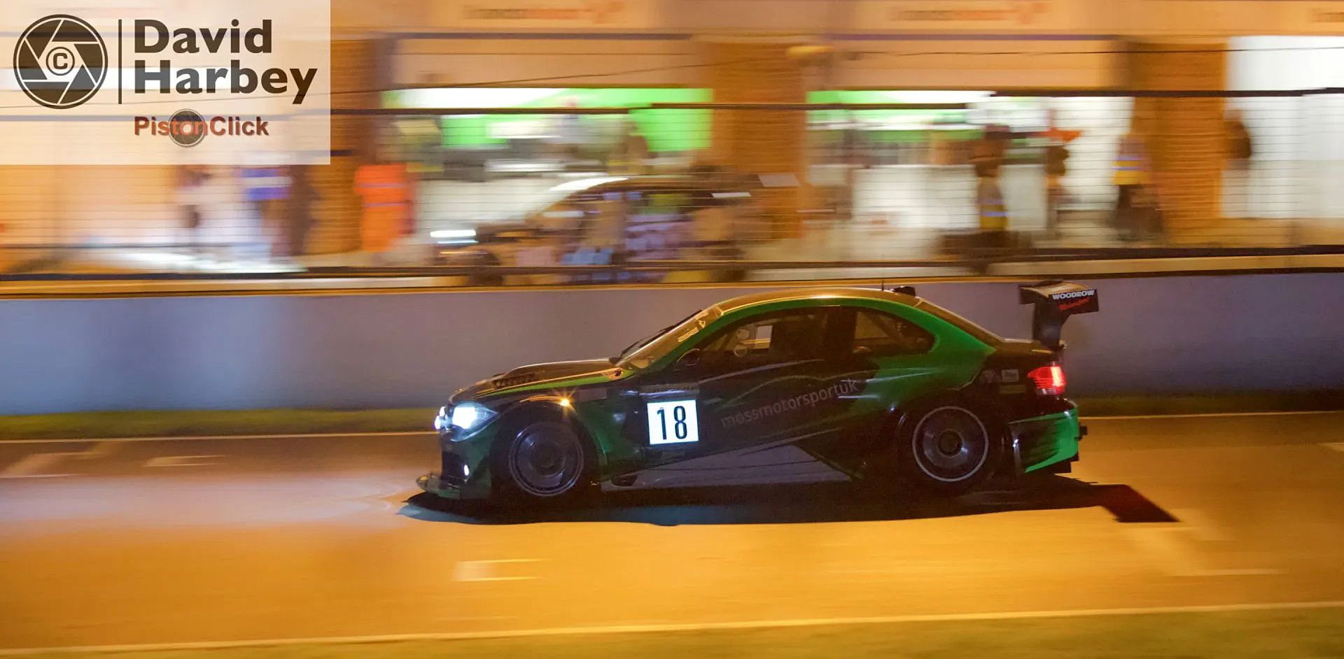 Moving down towards the start/finish line again you are shooting through the fence, but depending on the time of day you can still get a pleasing shot as shown here at the Into the Night Britcar Race.