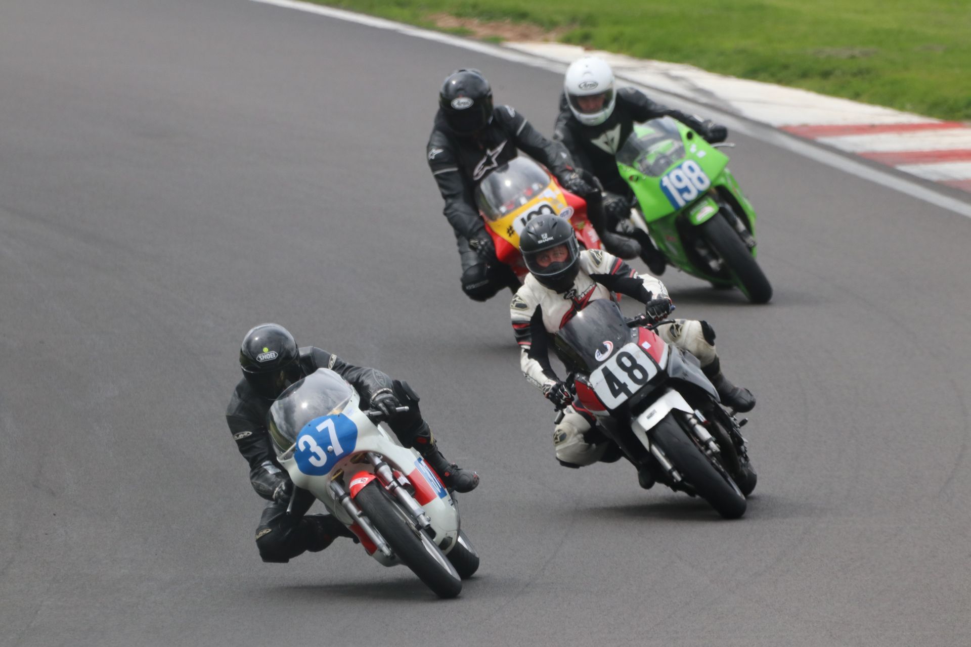 After a bad start Ant Hart (#75) on his Suzuki XR69 settled down behind leader Richard Blunt (#13) on his rapid Minnovation Kawasaki. Blunt took a tumble on the last lap allowing the highly committed Kurtis Butler (#24) and Simon Bastow (#23) to fill the lower steps of the podium.