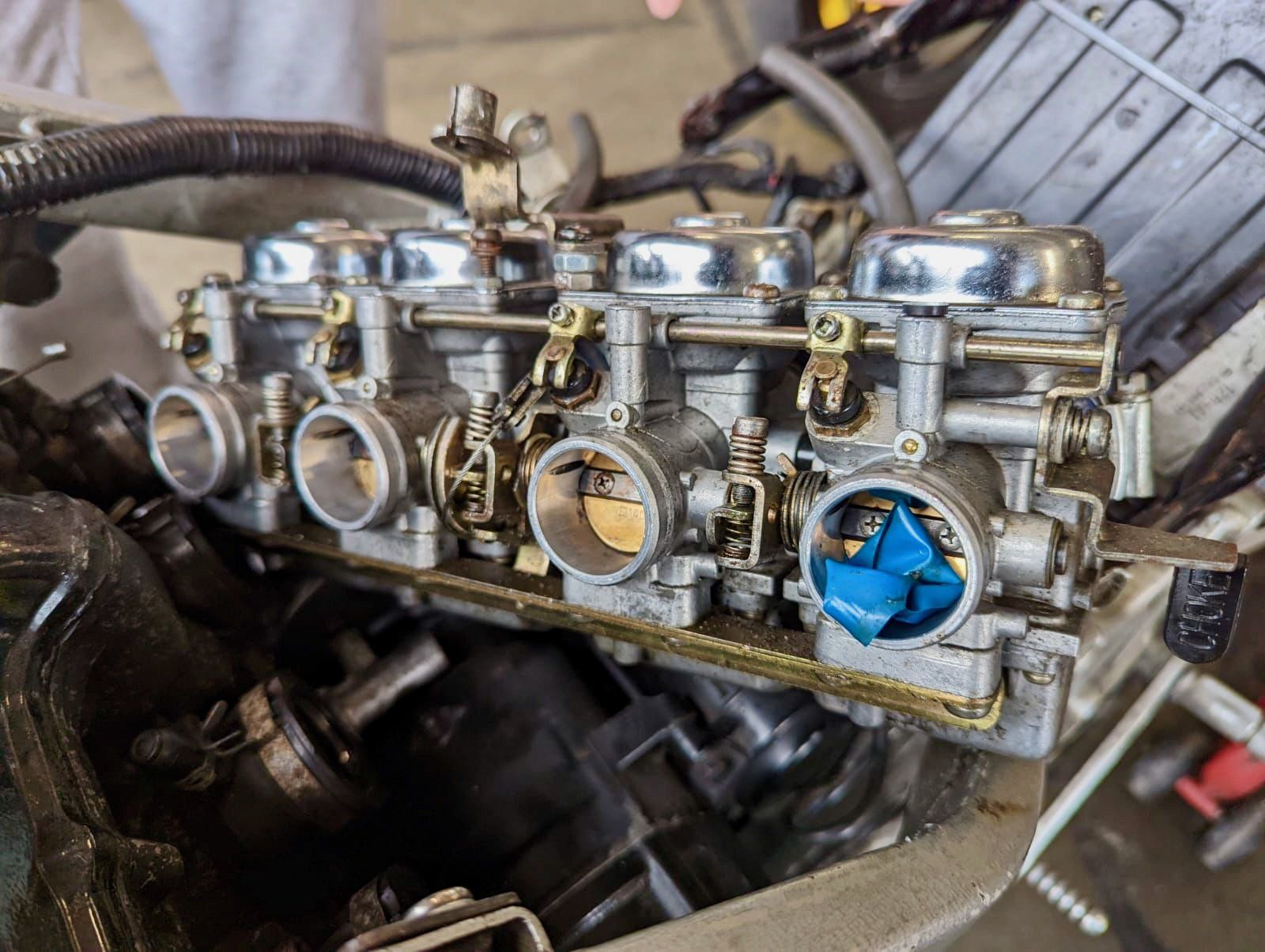 The cause of his problem when the bike was “stripped down” proved quite remarkable. Somehow, a significant length of blue insulating tape had been drawn through the carburettor, becoming jammed on the butterfly plate. The picture says it all.