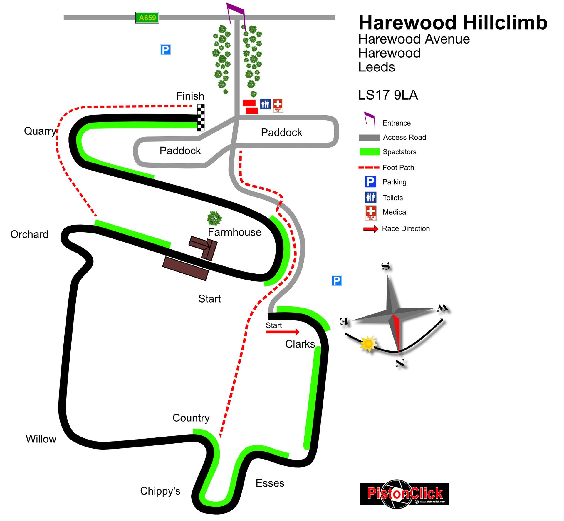 The Harewood Hillclimb centre is located in the picturesque Wharfe Valley between Harewood village and Collingham on the A659 - LS17 9LA will get you close.