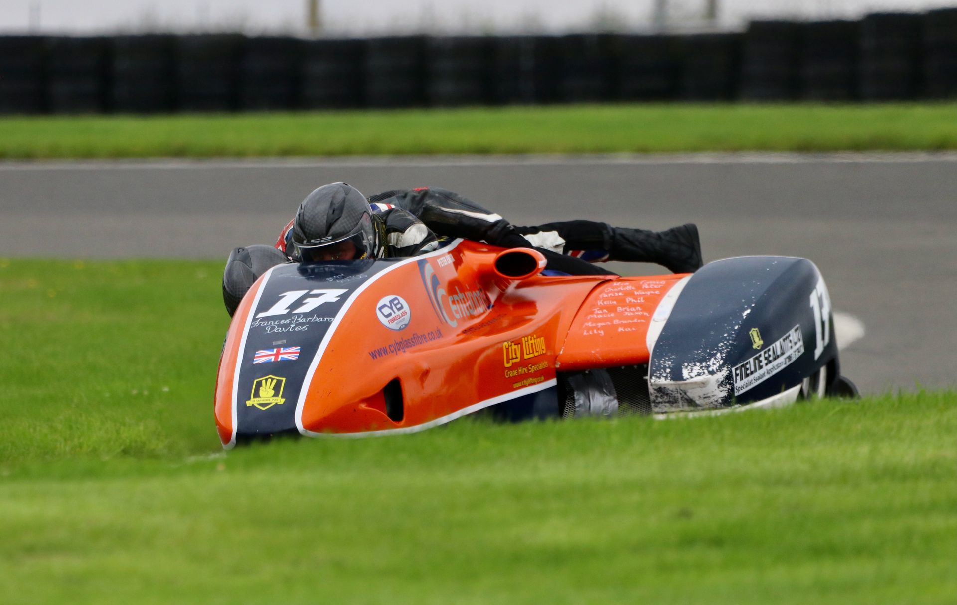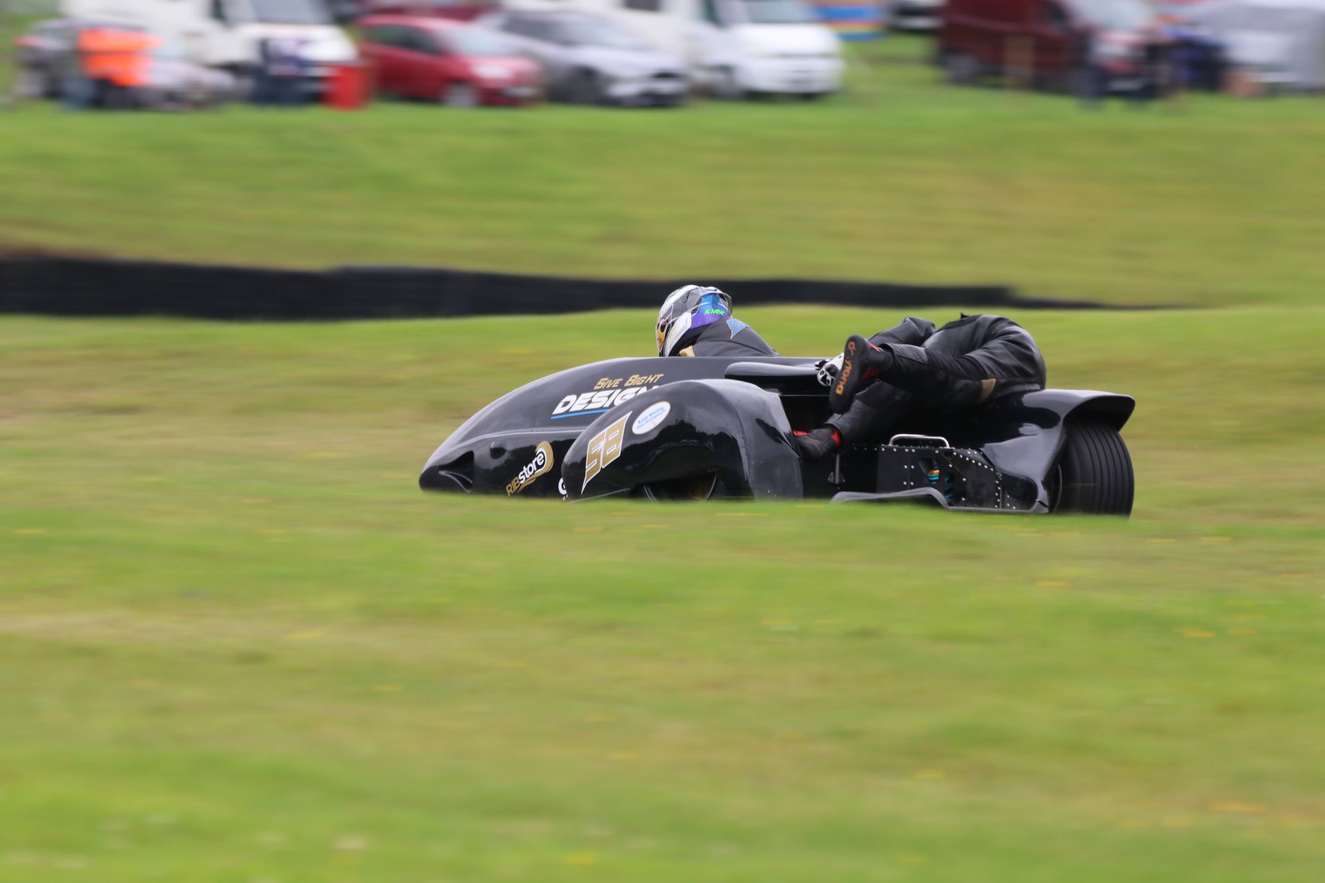 The rain relented following the break allowing five 6-lap “sprint” races for the support classes to take place in reasonable conditions. This was followed by the exciting British F1 Timed Qualifying after lunch, which was taken early to allow the track maintenance crew to make repairs to a section of barrier damaged when an outfit spectacularly overturned in the woodland section of the circuit. I’m pleased to say both rider and passenger, who was catapulted into the crowd on impact, emerged relatively unscathed from the experience and have every intention of returning to action next weekend at Snetterton.