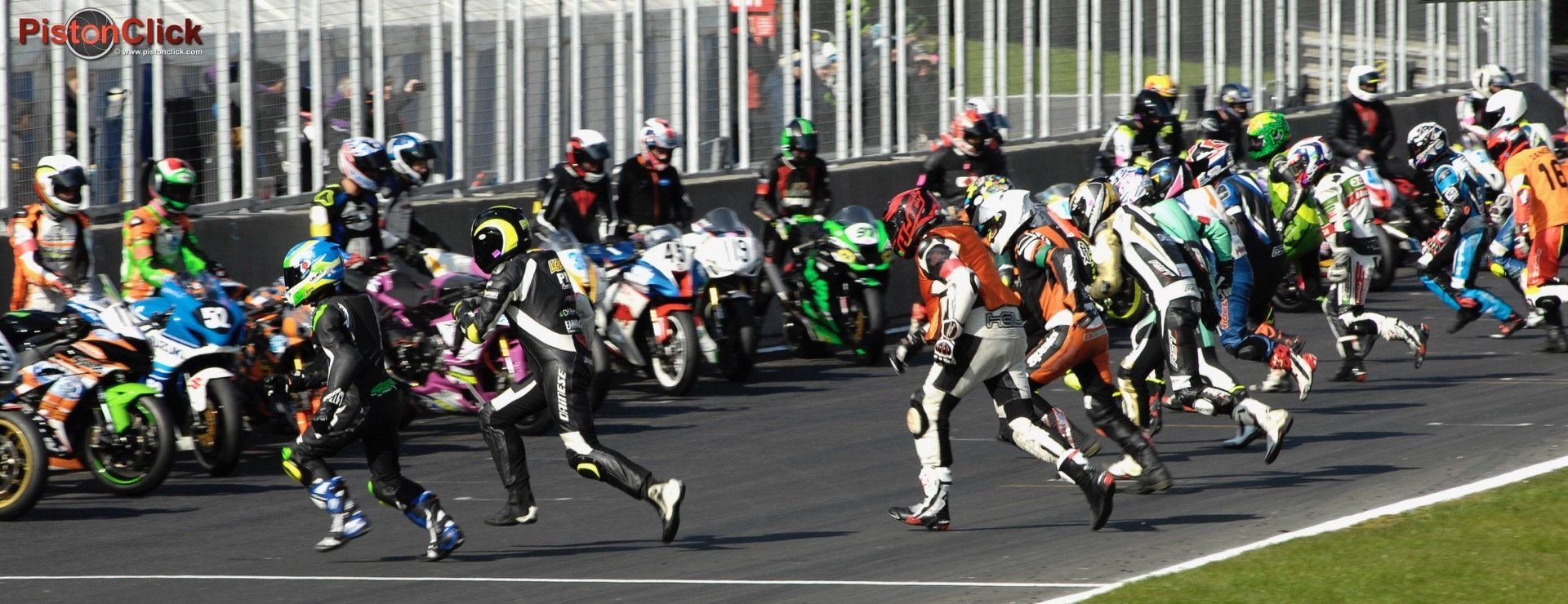 The machines are lined up fastest first along the pit wall at 45deg to the track with the first rider standing on the other side of the track behind a white line. When the flag drops or the lights go out the riders sprint to their bikes which are being held by a team member, the rider has to start the bike and off they go.