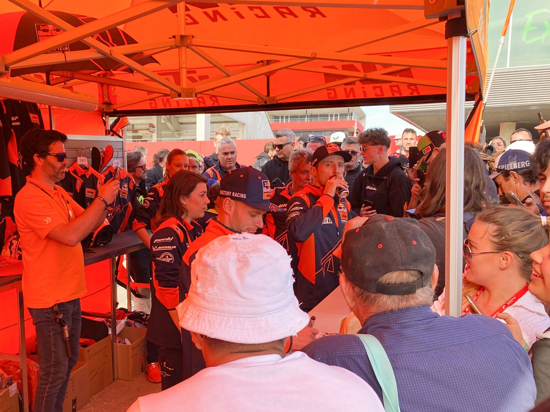 At the end of Saturday’s action, we were walking past the merchandise stands and there was suddenly an orange commotion. Brad Binder and Jack Miller had arrived to sign autographs and meet the fans. Jack here supping an appropriate beverage.